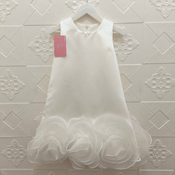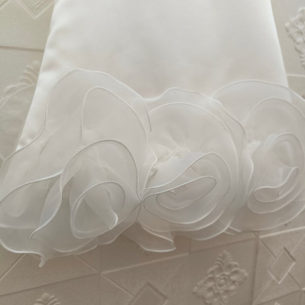 - Detalle de rosones en organza en todo el filo del vestido, acabado 3D
