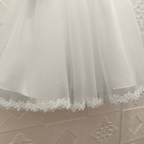 - Detalle bordado entre pecho y cintura, cinta satinada para amarrar lazo