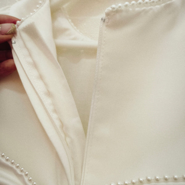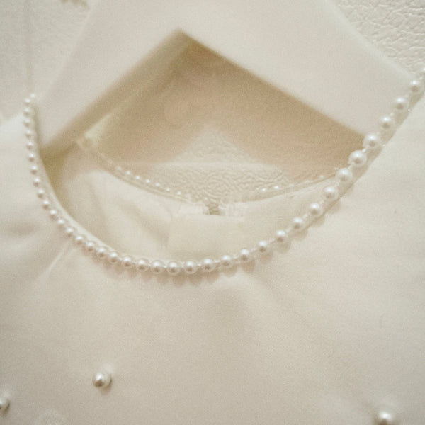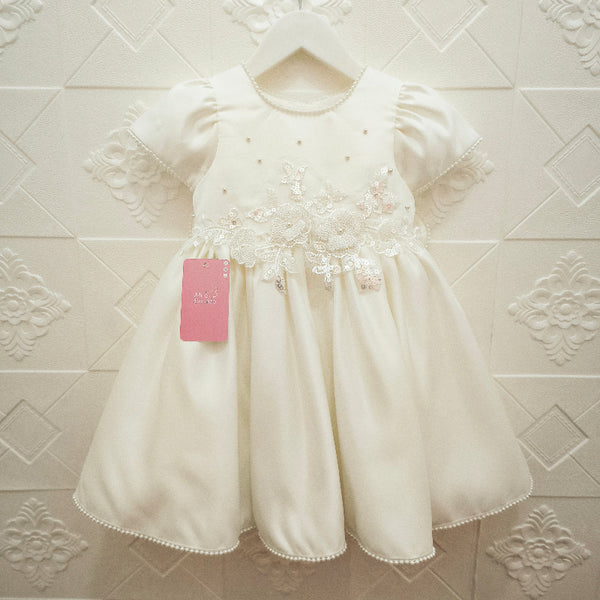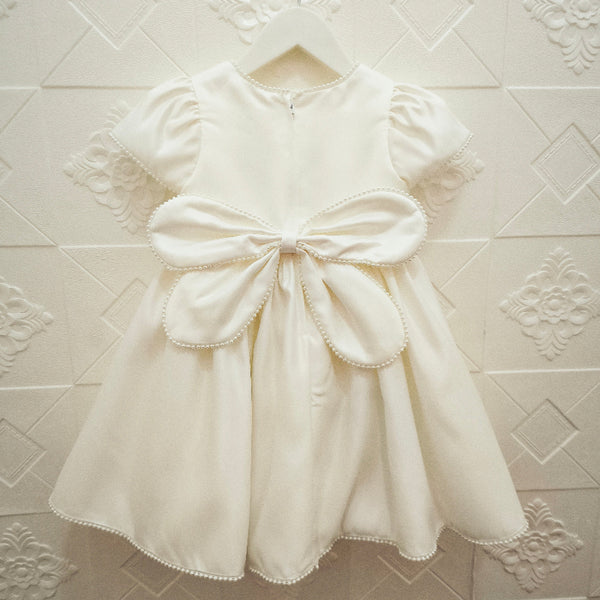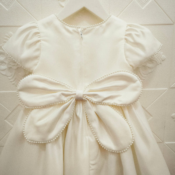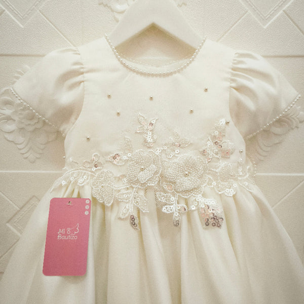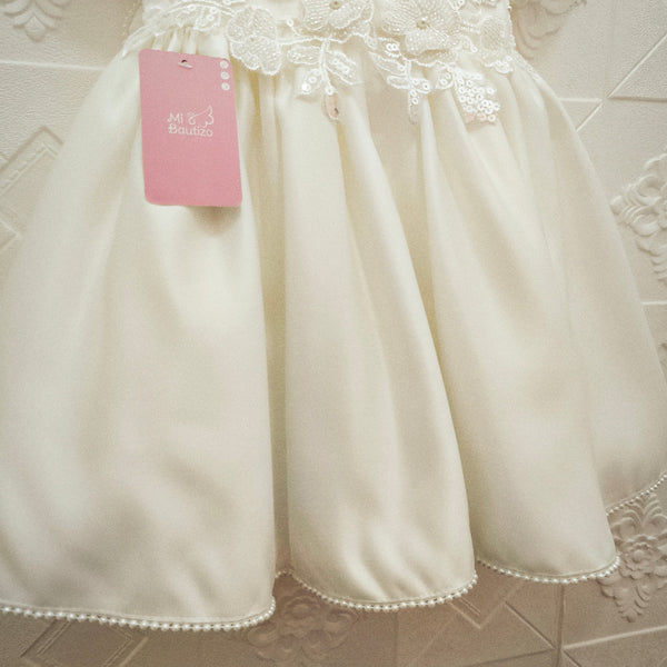 - Detalle de lazo en michi cosido en espalda, flores 3D en cintura, mini perlas en filo de vestido, mangas, cuello y lazo