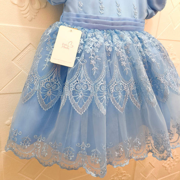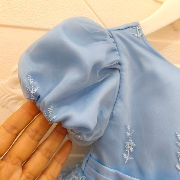 - Material: organza bordada, satén y forro interno.