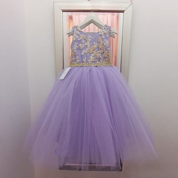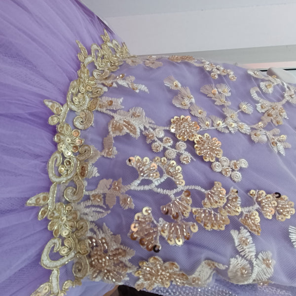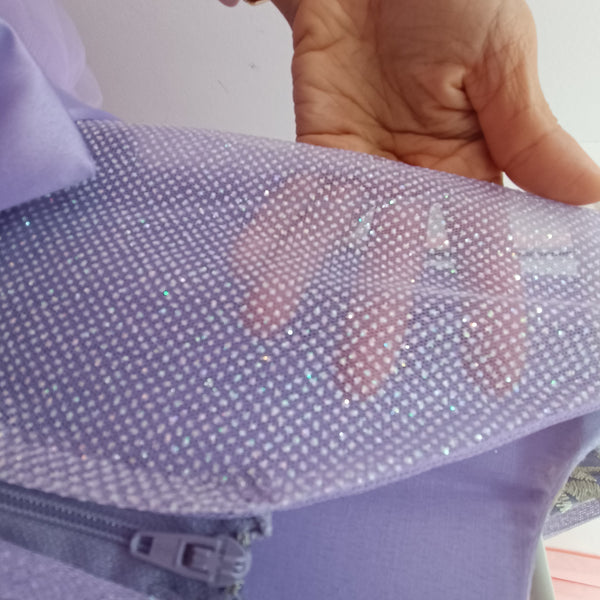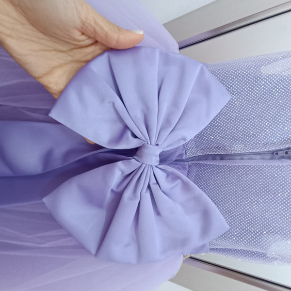 - Detalle: escote espalda en V con tul brilloso y maxi lazo removible