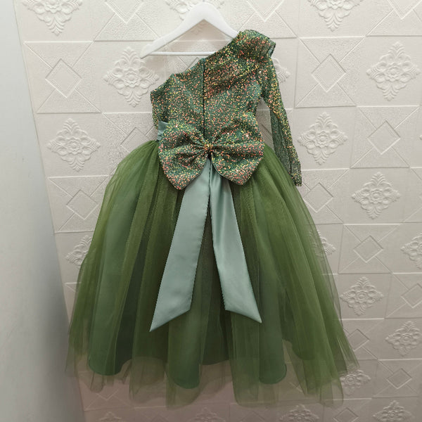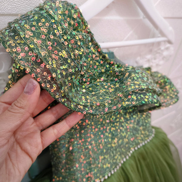 - Detalle: escote completo en 1 hombro, pecho y manga con baby lentejuelas y maxi lazo removible.